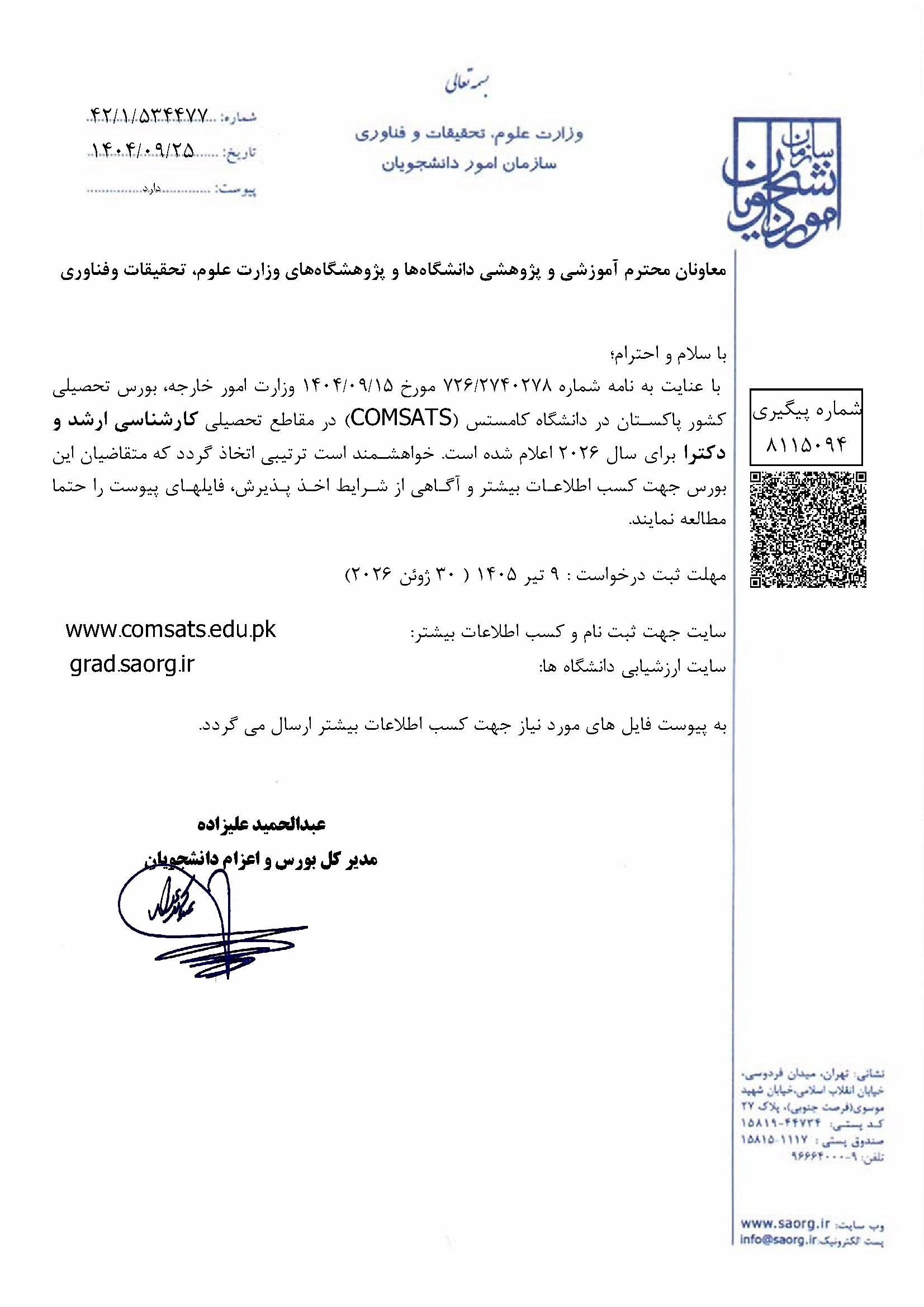 فراخوان بورس تحصیلی ارشد و دکتری دانشگاه کامستس پاکستان - دفتر همکاریهای بین الملل